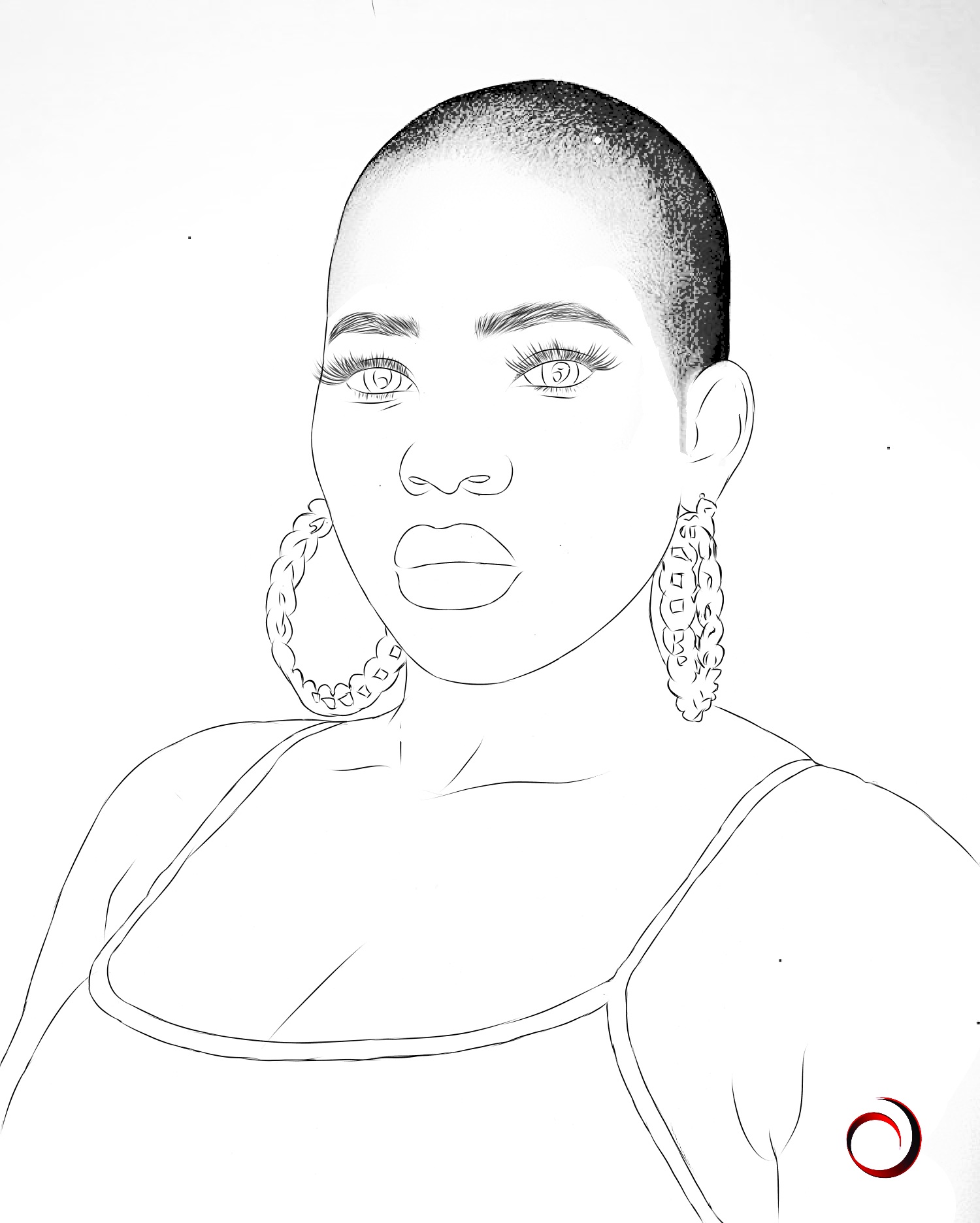 Sketch view of a lady with a low-cut, looking straight at the camera